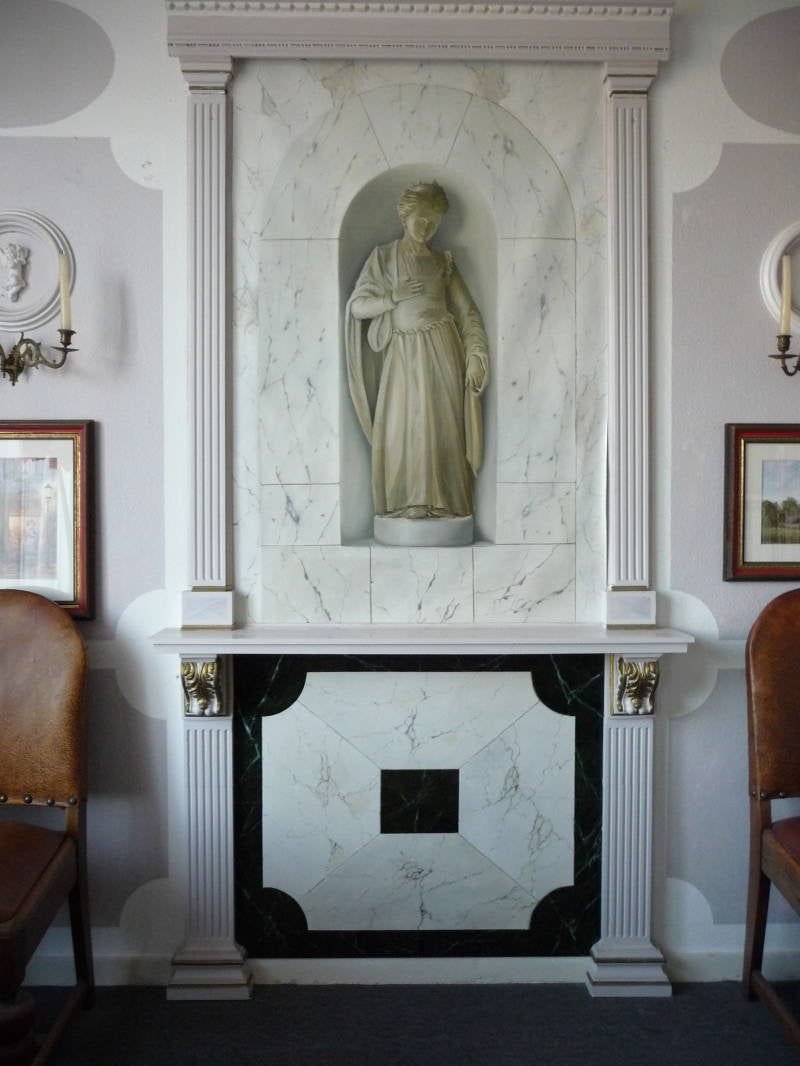 Tromp l'oeil betekent: het oog vergist zich. Een marmeren beeld van een vrouw staat in een nis die met marmeren tegels is omgeven. Let wel! Dit is dus in marmer imitatietechniek geschilderd. Door een goede licht-donker verhouding (toonwaarde) lijkt het alsof er werkelijk een nis in de muur is gebouwd met daarin een beeld.